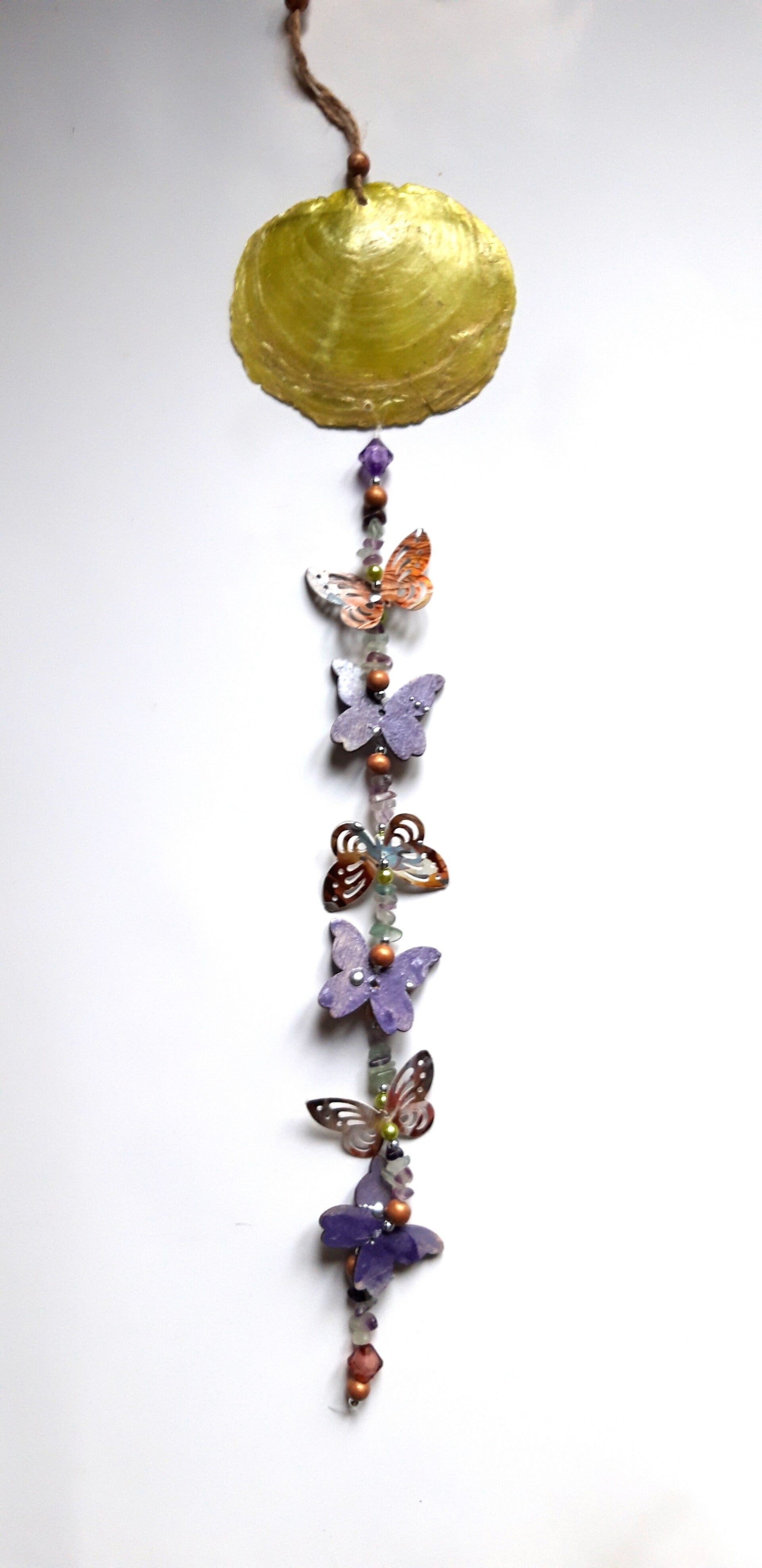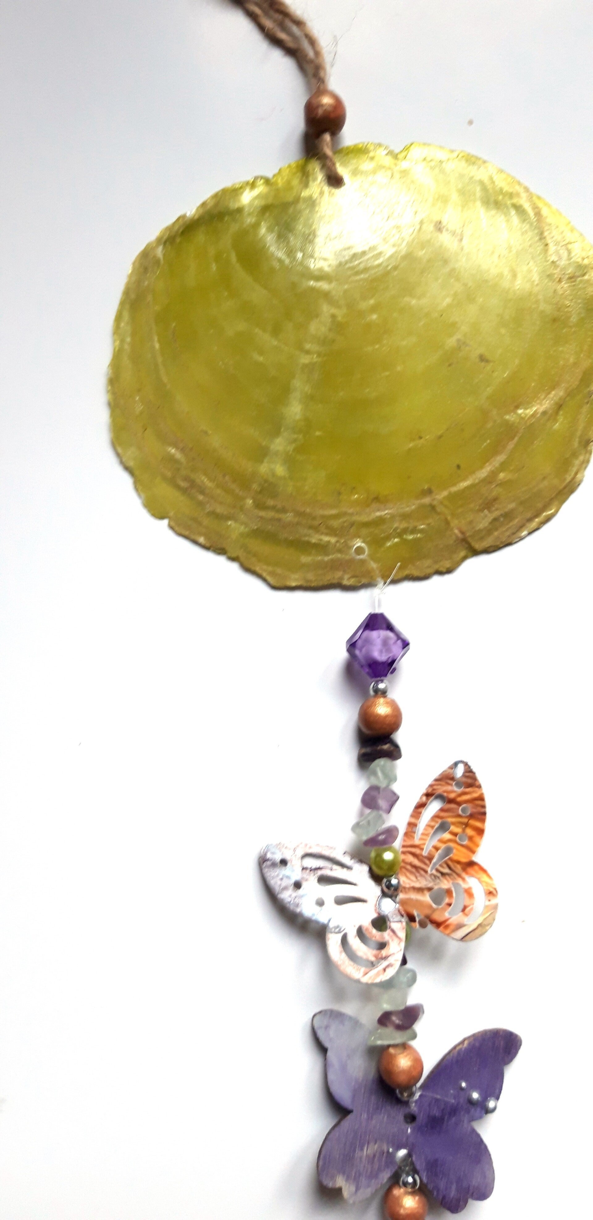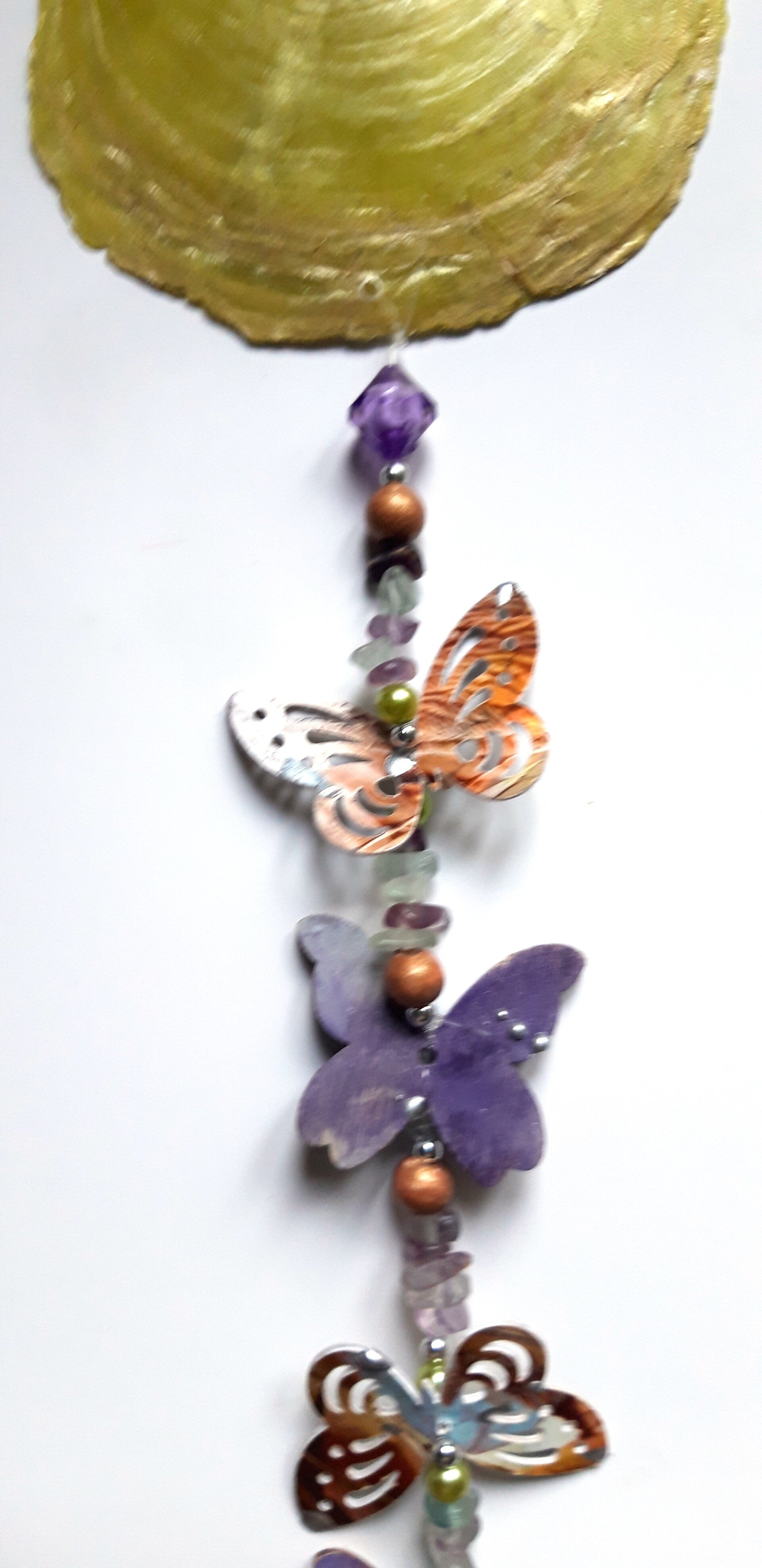 Unieke raam/muurhanger bestaande uit capsiz schelp, edelstenen en vlinders.