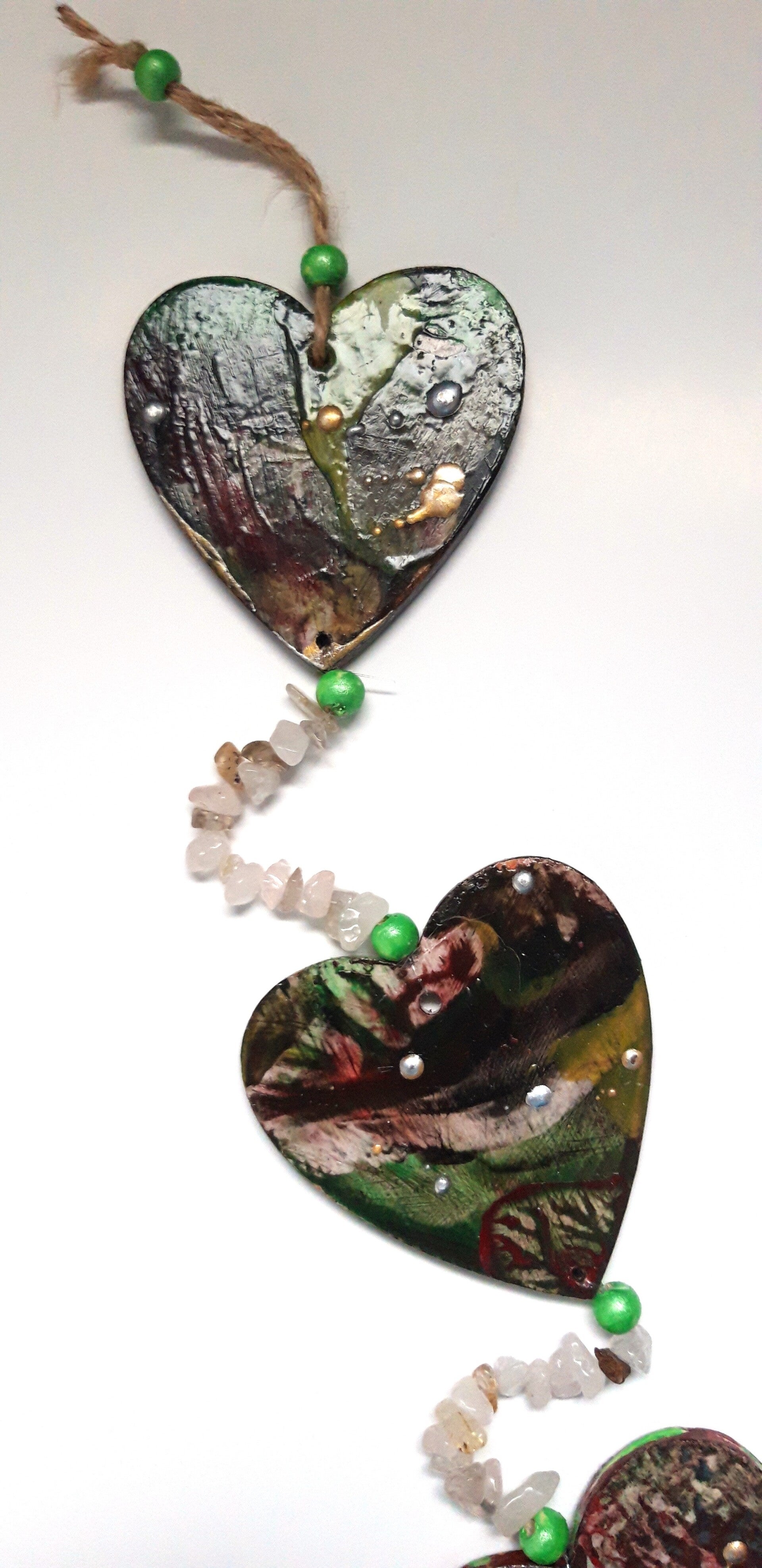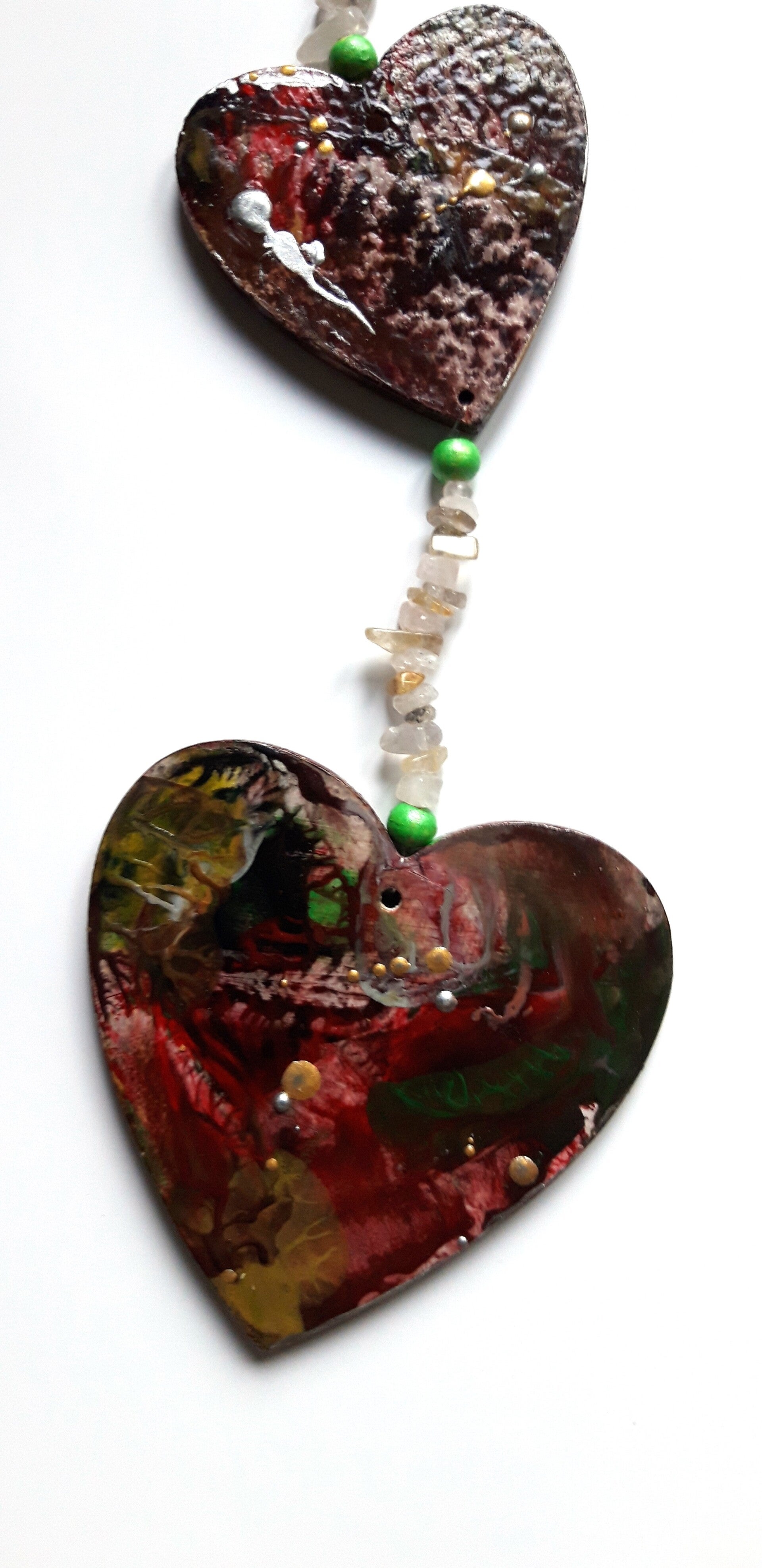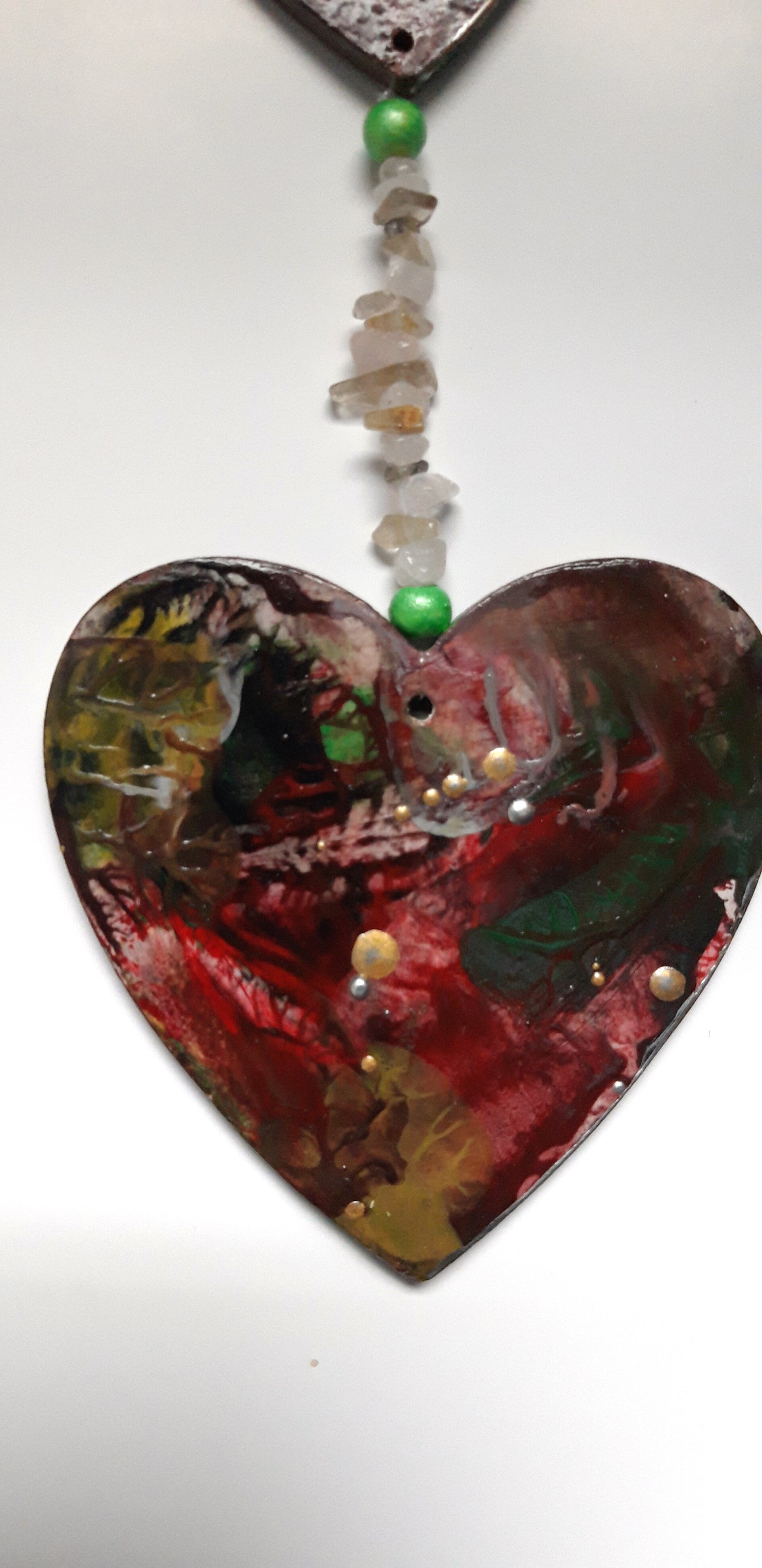 Unieke raam/muurhanger met edelstenen en harten bergkristal en rookkwarts