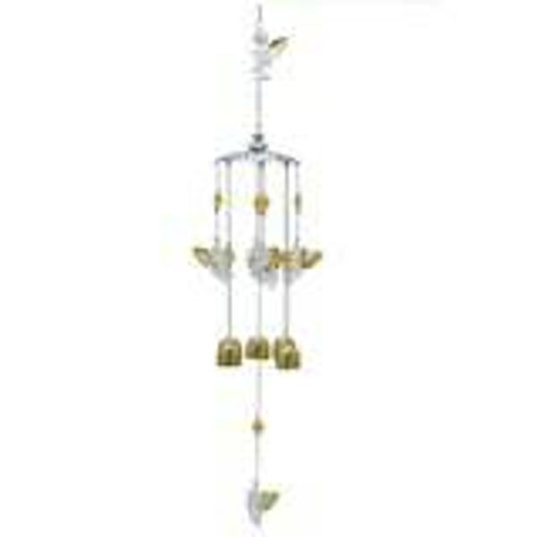 Zinnestrelende windbellen met vijf transparante engelen met goudkleurige vleugels.