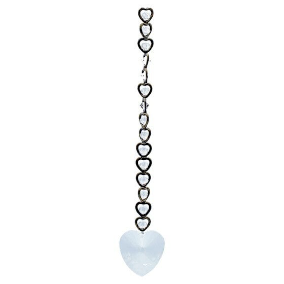 15 zink-legering hartvormige schakels die sprankelende kristalletjes omvatten met een groter kristallen hart aan de onderzijde.