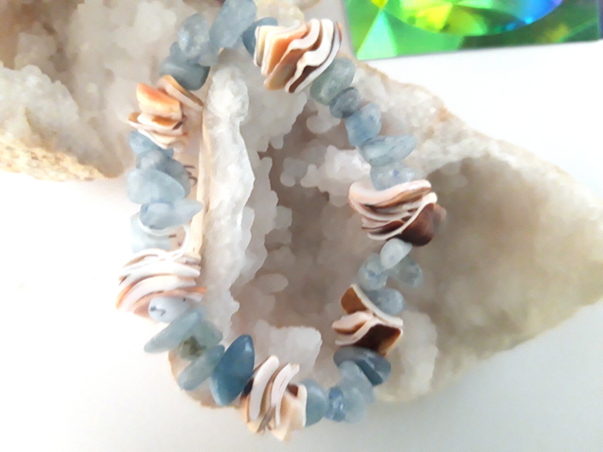 Elastisch split armband gemengd aquamarijn met schelp