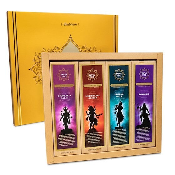 Giftbox met 4 speciaal geselecteerde wierook van de Hindoe Goden: Laxmi, Ganesha, Krishna en Shiva (Shivohum). Hoge kwaliteit wierookstokjes met natuurlijke ingrediënten. Begin je dag, mediatie of puja met deze geuren.
