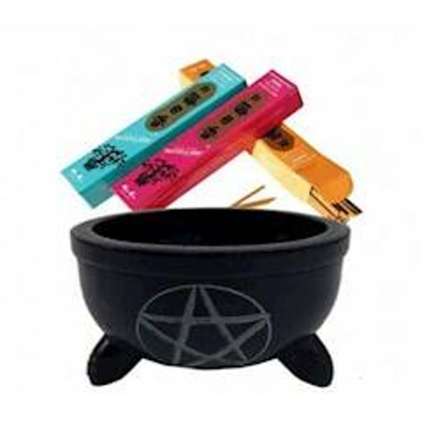 Wierookbakje zwart zeepsteen Ohm of pentagram + witte steentjes