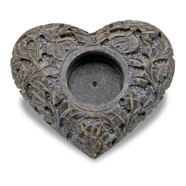 Van gepolijste zeepsteen, hartvormig. Geschikt voor het branden van zowel een wierookstokje als een waxinelichtje.
