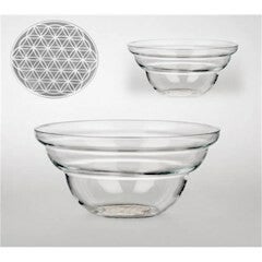 Deze 'Cotula'-schalen hebben een goed doordacht ontwerp, volgens de gulden snede, en zijn voornamelijk bedoeld voor gebruik bij het bereiden en genieten van een maaltijd. Het met de mond geblazen glas wordt zorgvuldig geproduceerd door vakmensen. De Bloem des Levens is in wit in de bodem van de schaal gebrand. Vanwege het formaat ervan is de werking hier bijzonder goed. Afmeting: 12 cm