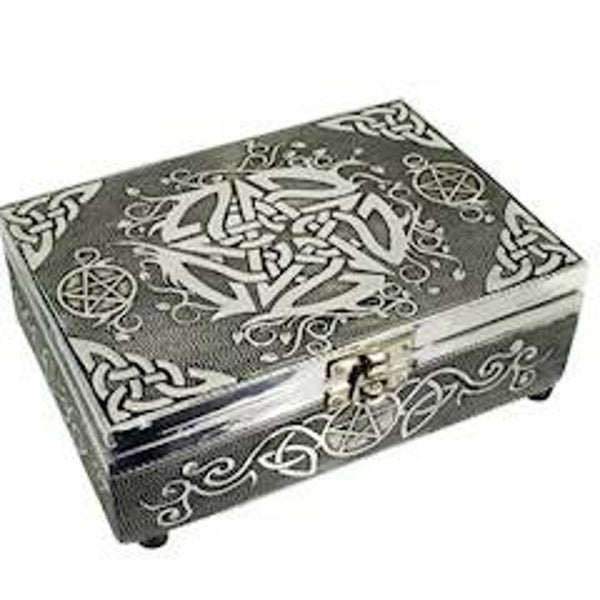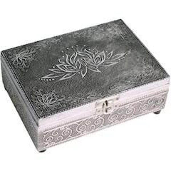Fraaie doos bedekt met aluminium reliëf plaatwerk met Ohm symbool, dromenvanger, lotus of pentagram. Gestoffeerd aan de binnenzijde, met rubber pootjes.
