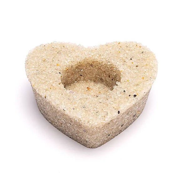 Hartvormige theelichthouder, gemaakt van stukjes bergkristal.Bergkristal staat in de edelsteentherapie bekend als een zuiverend mineraal die helderheid en balans bevordert.