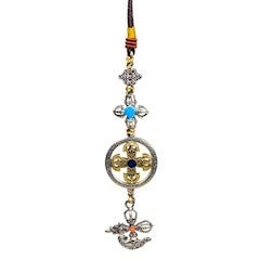 Boeddhistische beschermhanger voor in de auto, huis, of aan je tas of sleutelbos. De Dubble dorje staat symbool voor stabiliteit en bescherming tegen angst. Een Kartika is een ritueel mes dat het doorklieven van onwetendheid en gehechtheid symboliseert.