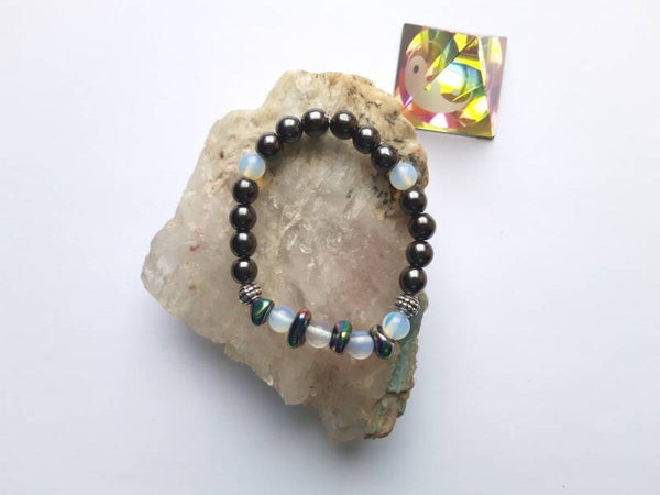 Magnetische armband met hematietkralen, hematiet multicolor, opaal edelsteen kralen 8 mm, elastisch, antiek zilver.
