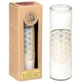 Stearine geurkaars in gerecycled glas, wit met goudkleurig bloem des levens symbool.
