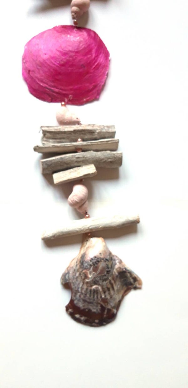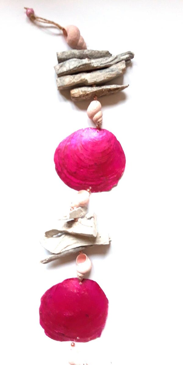 1 hanger met schelpen en Capzis schelp rose groot met drijfhout. Totale lengte ongeveer 80 cm.